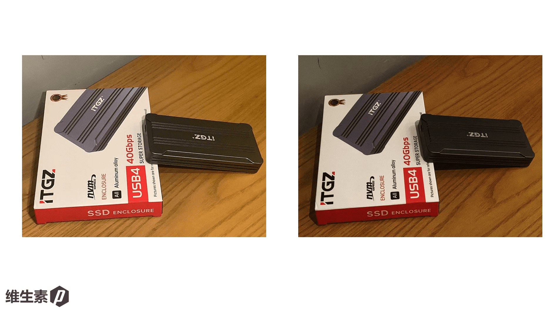 随手拿了正在用的一个移动硬盘做一下拍照对比吧,很明显可以看到左边打灯之后的拍摄效果和观感,都要好于右边没打灯的情况。