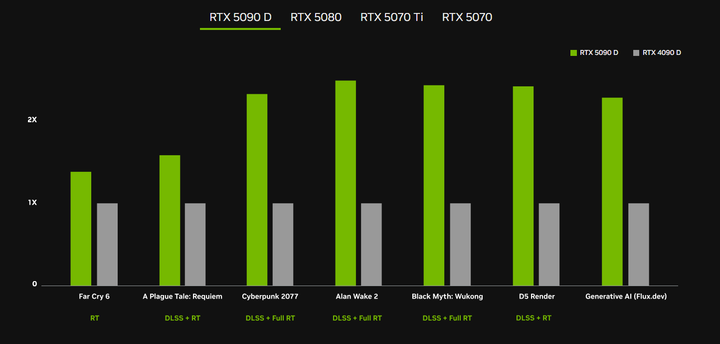 - RTX 5090D 比 4090D 提高了 38.2%