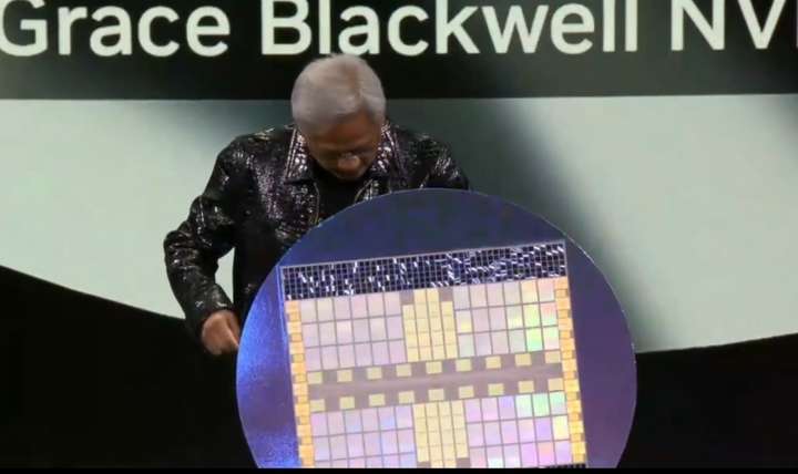 发布会上就展现了一个放大版的工程样品,可以看到这下面这个芯片有 4 组 18颗 Blackwell GPU,一共 72 个。通过全新的 NVLink72 技术,可以连接多达 72 个 Blackwell GPU,提供强大的计算能力,使得有更好的算力处理复杂的AI和科学计算任务。