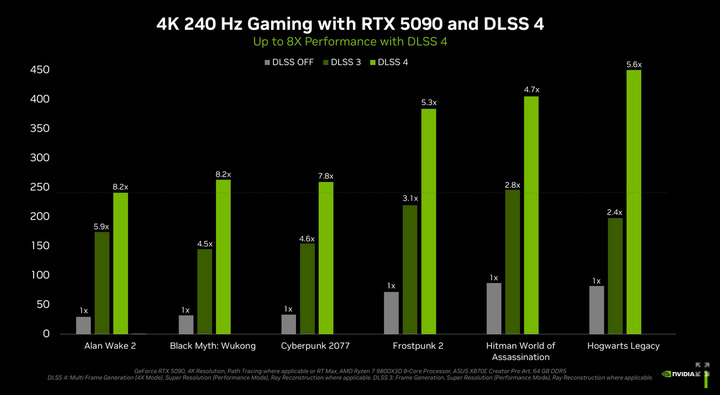 而这一次 RTX 50 系显卡在游戏表现上大杀四方,甚至高达 2 倍游戏表现的原因,大概率和 DLSS 4 新架构下的新技术 —— 多帧生成,有非常密切的关系。