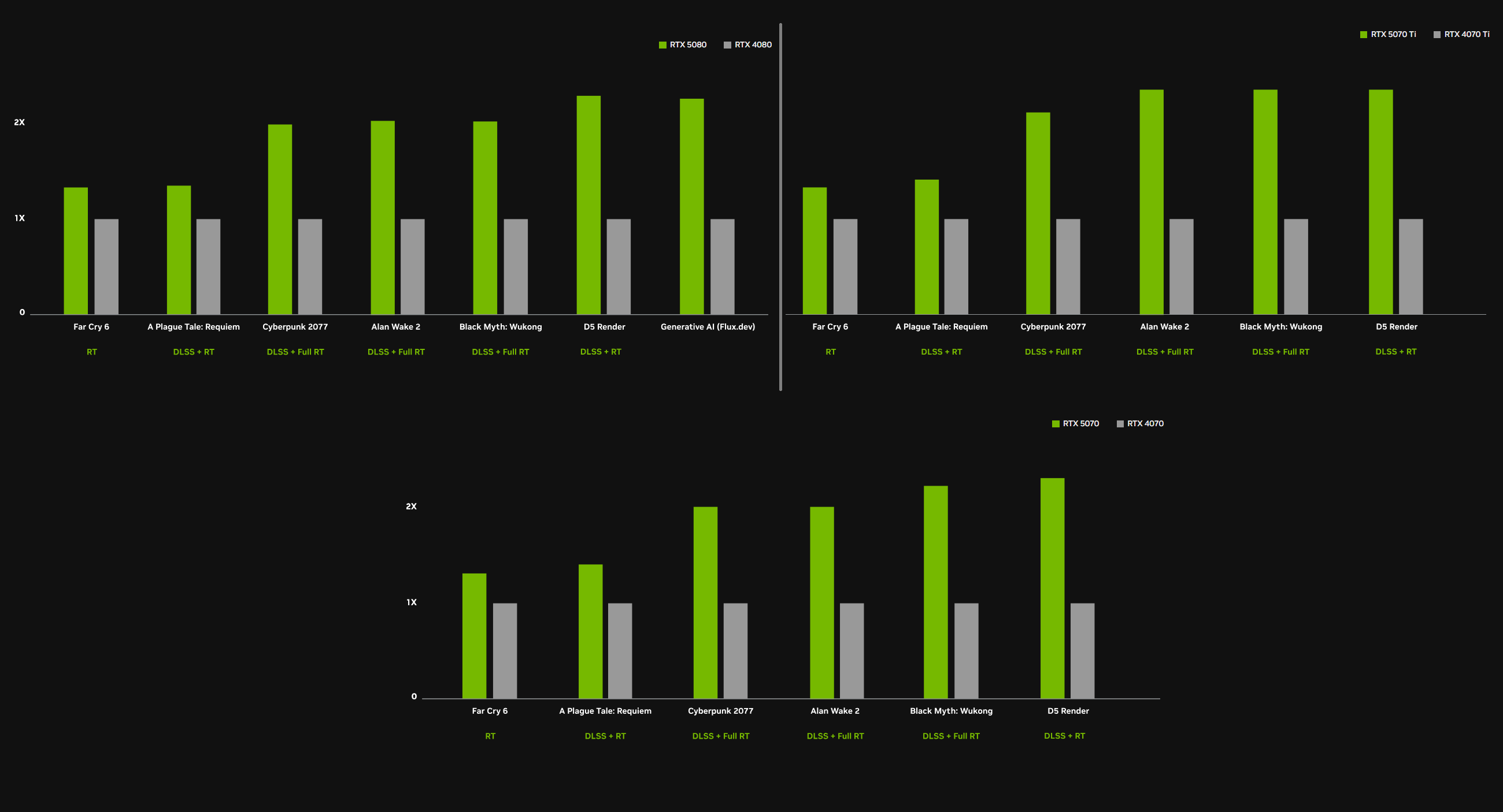 其他同系列相比于 40 系也有很强的进步,5080 的4K极致游戏表现,以及 5070/5070Ti 的2K极致表现都大幅提高,部分大作甚至达到 2 倍的性能。