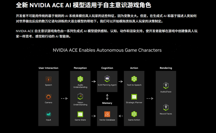 NVIDIA 的 ACE 技术,现在可以让AI游戏角色拥有自主意识了,相比以前传统式固定逻辑的笨笨的AI机器人,使用了 NVIDA ACE 的角色,可以像真人玩家一样在游戏里动态实时的根据当下状态进行决策,通过内置的角色设定和游戏数据,以及不同的AI模型技术,AI队友会收集和感知当下的状态,通过内置的推理进行理解,并且思考,进而产生下一步的行动,并且记忆状态来追踪长期目标。