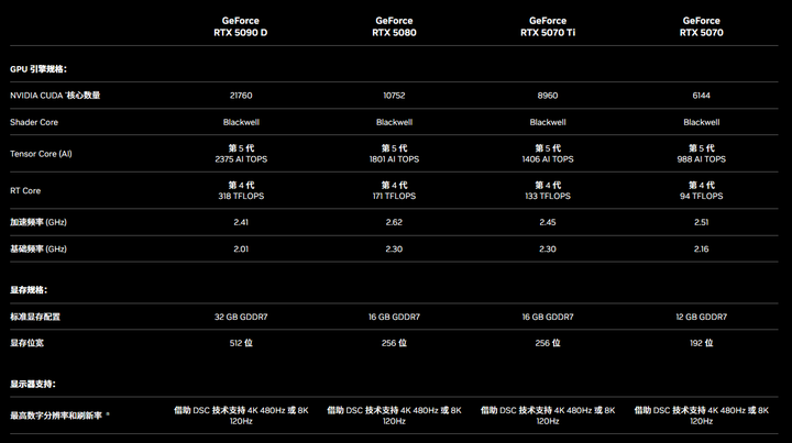 - RTX 5090D :CUDA 数 21760,32G 显存,512bit 位宽,总功耗 575 W,16499 元起。