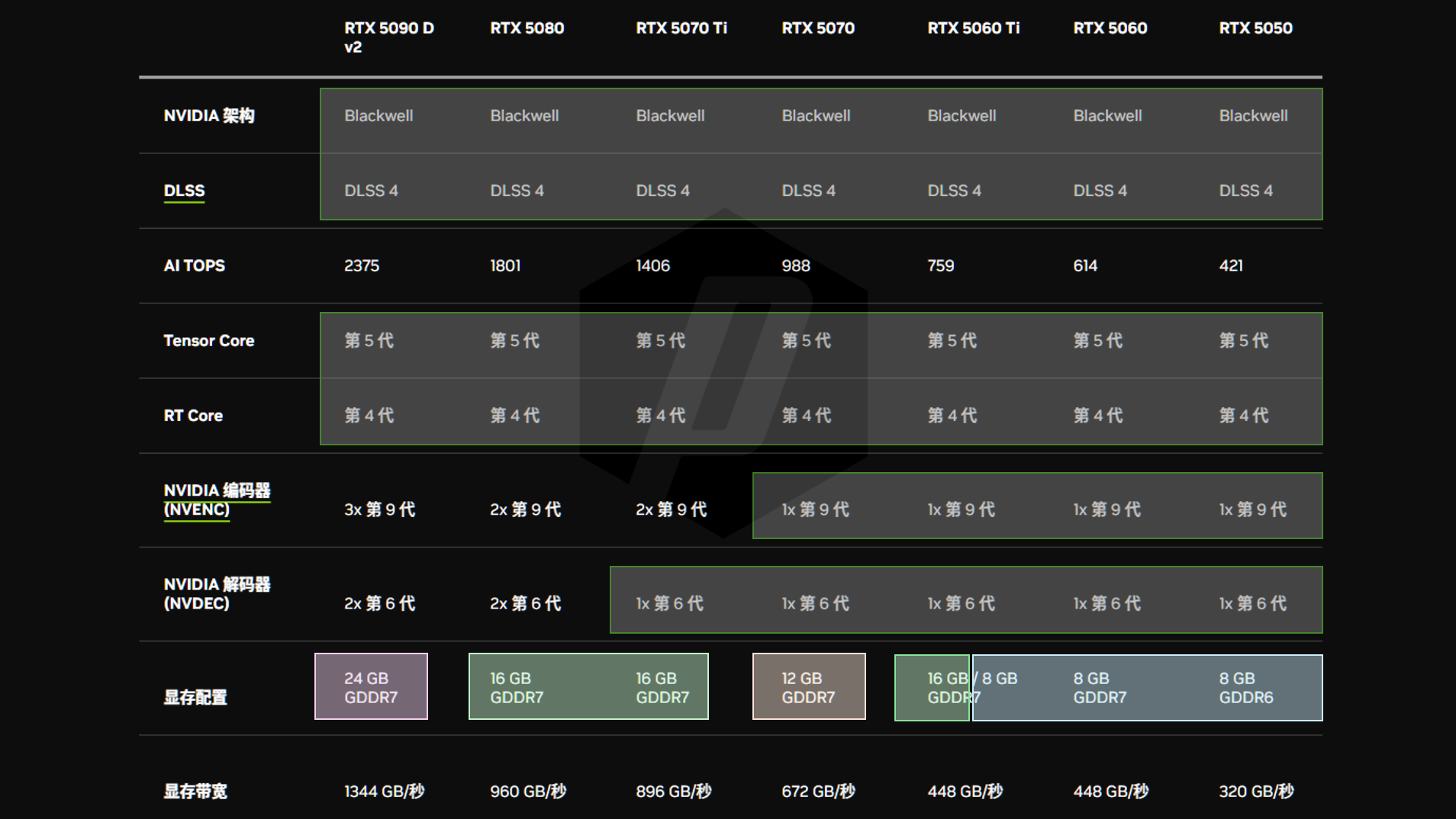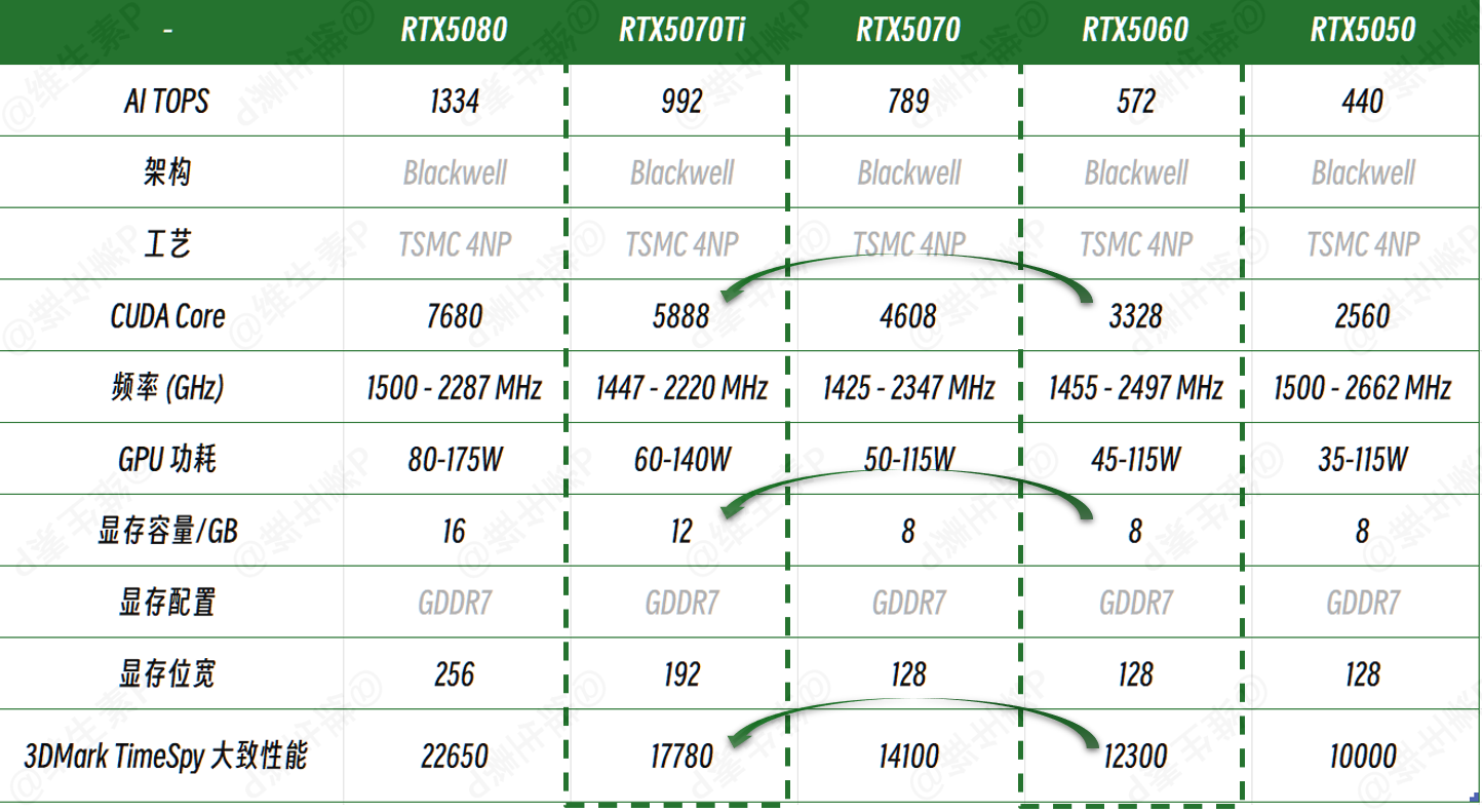 - RTX 5070 Ti 的 显存容量达到 12 G,比 RTX 5060 多 50%